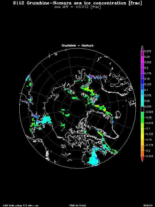 The original satellite data was on a ~25 km polar stereographic grid and was then interpolated to a lat/lon grid for use in models. Nomura applied extensive quality control of the lat/lon sea ice concentration to eliminate bad and missing data. He choose a weekly time interval to insure sufficient observations in each grid box as the SSMR sampling was less than the SSM/I. Whereas Nomura started with SIC, Grumbine uses the radiation data directly and applies quality control to both the source data and SIC product. More significantly, Grumbine performs his analysis daily.