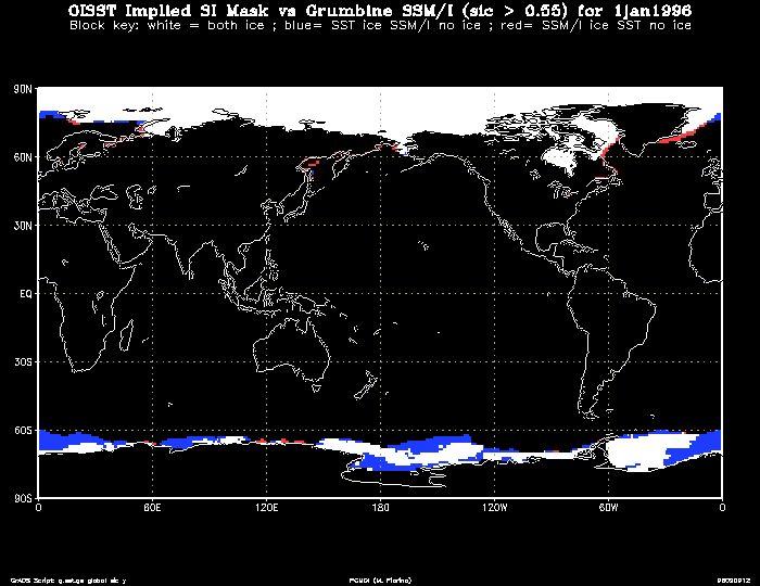 Both the GISST2.2a and OISST data sets contained internal sea ice masks (SST ~ -1.8 C) derived from different sources. Furthermore, these internal masks differed from that in the Nomura/Grumbine SIC. Thus, the SST and SIC used in reanalysis could conflict. For example, the OISST might have a point which is sea ice (-1.8 C) but the SIC data has the point as open ocean. Conversely, the SIC might define a point as being ice, but the SST would be warmer than the sea ice temperature.The problem is illustrated for the daily analyses of 1 January, 1996. The white boxes show where the original SIC and SST data were defined as sea ice using 0.55 as the threshold value for the mask. The blue boxes show where the SIC analysis defines open ocean but the OISST is sea ice, and the red boxes where the OISST is open ocean and the SIC analysis indicates sea ice. The greatest areal extent of the conflicts occur in the southern ocean although the difference in SST between the original and purified SST analysis is not large. In the Arctic, we find more unfrozen points in the OISST where the SSTs are considerably warmer that sea ice.